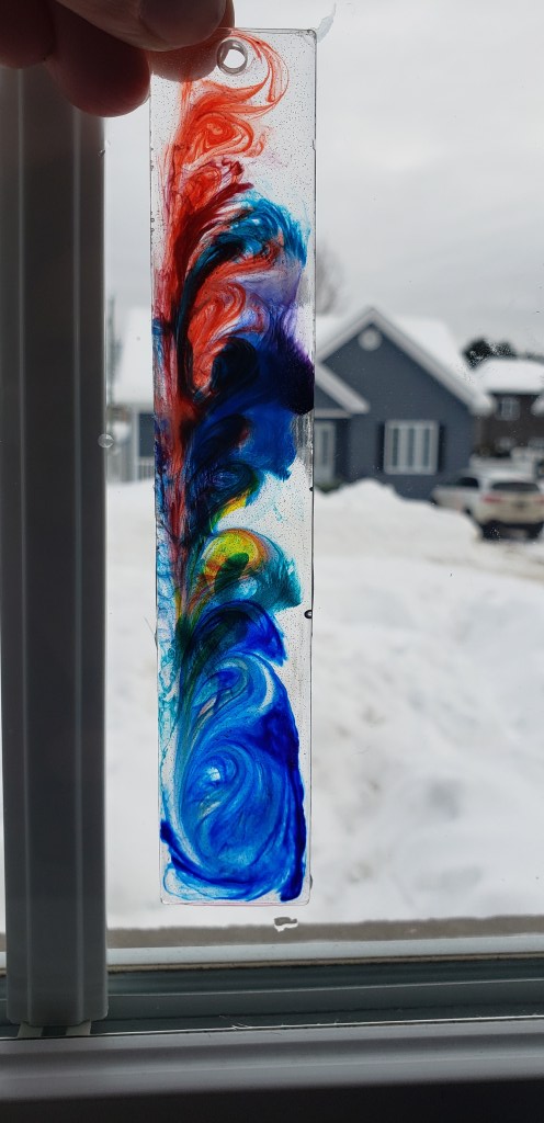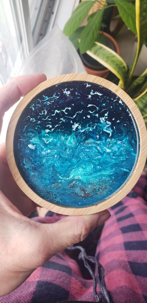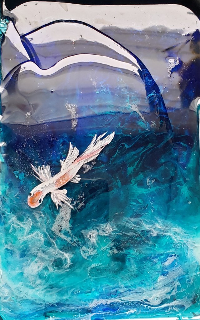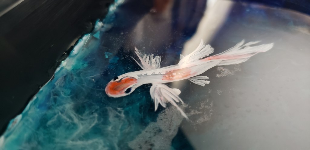 Koi fish Epoxy Resin is by far the most sticky and messy medium I work with. It’s three equal parts prep, execution, and clean up. But don’t put things away too far if your project isn’t a single application. One coat takes 24 hours to dry and harden. Resist the temptation to lose your patience.