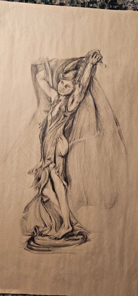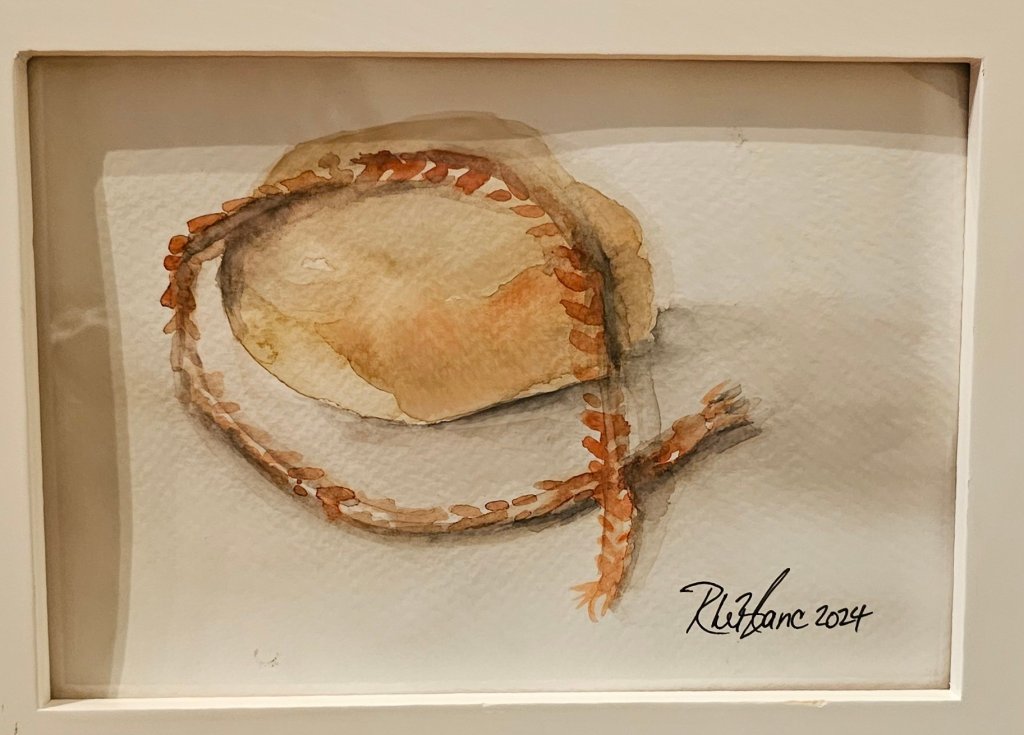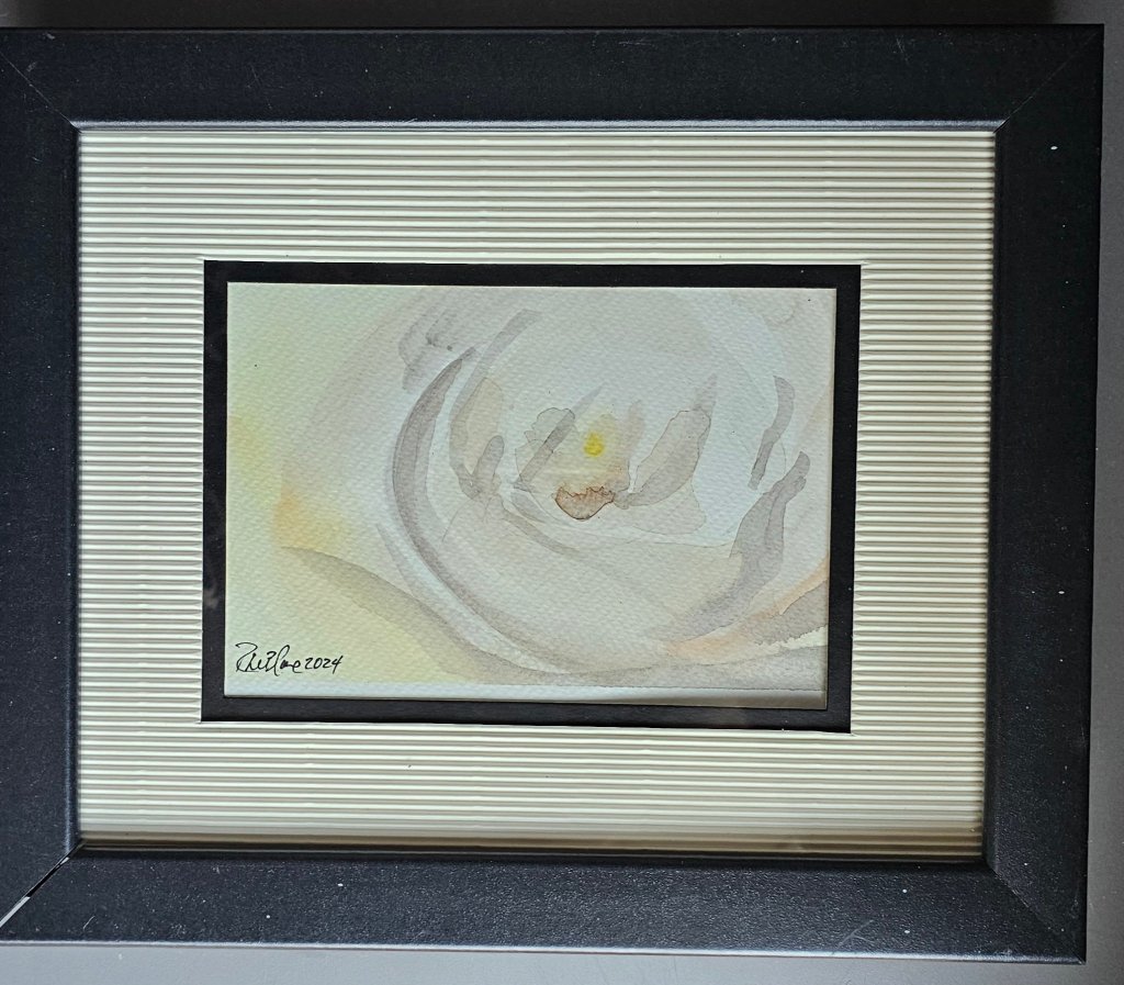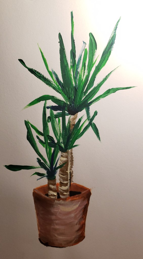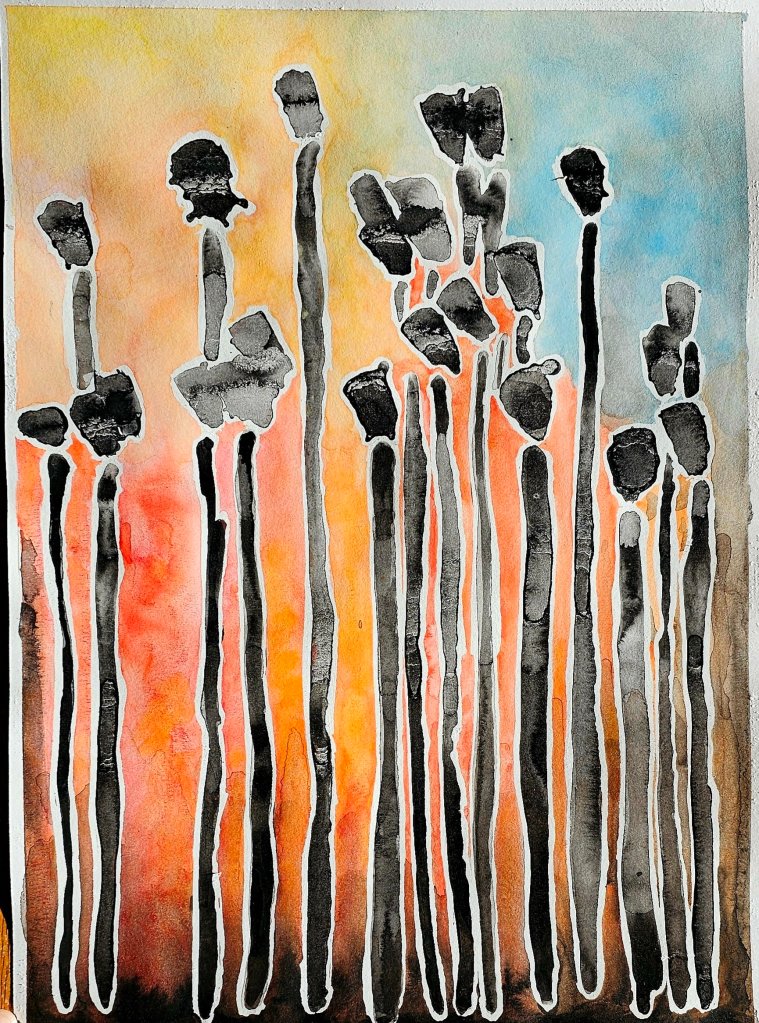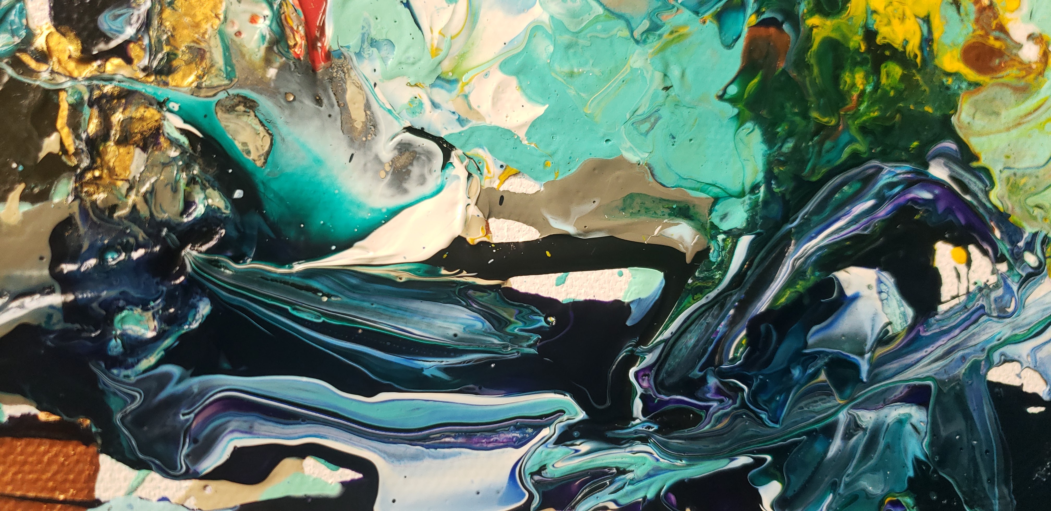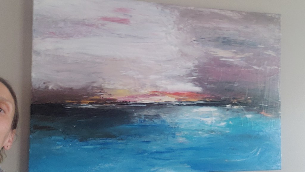 Sky Line, acrylic on canvas, applied with my hands, no brushes. Not including the prep time, this took me about 40 min to make. Sometimes it can be hard to know when to stop. Generally less is more, if you’re not sure, take a break and walk away so you can come look at it again with fresh eyes. If you’re still not convinced of your art, call it an attempt and forget about it. I often keep the duds and recycle the canvas for another day.