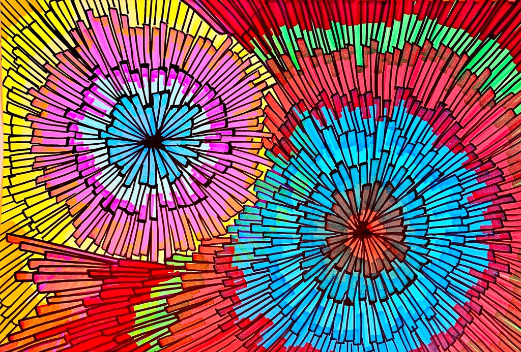 A quick note on the ink – I’ve actually unscrewed a few of my markers to remove the core (gloves are a must here), and I squeezed drops from the wadding into one of my cups. Add a few drops of the rubbing alcohol to the pigment and slowly pour it onto your paper. You’ll see how this is a random art in many ways. You can tilt the paper to guide where you want the ink to go, it dries pretty fast so you’ll see results quickly. Here’s where you can add layers. If you make a small puddle, you can guide it around the paper with a hairdryer with very pleasant results as well. Experiment with letting the ink drop and splash and bleed into each other – it’s a distinct look and it’s just plain fun!