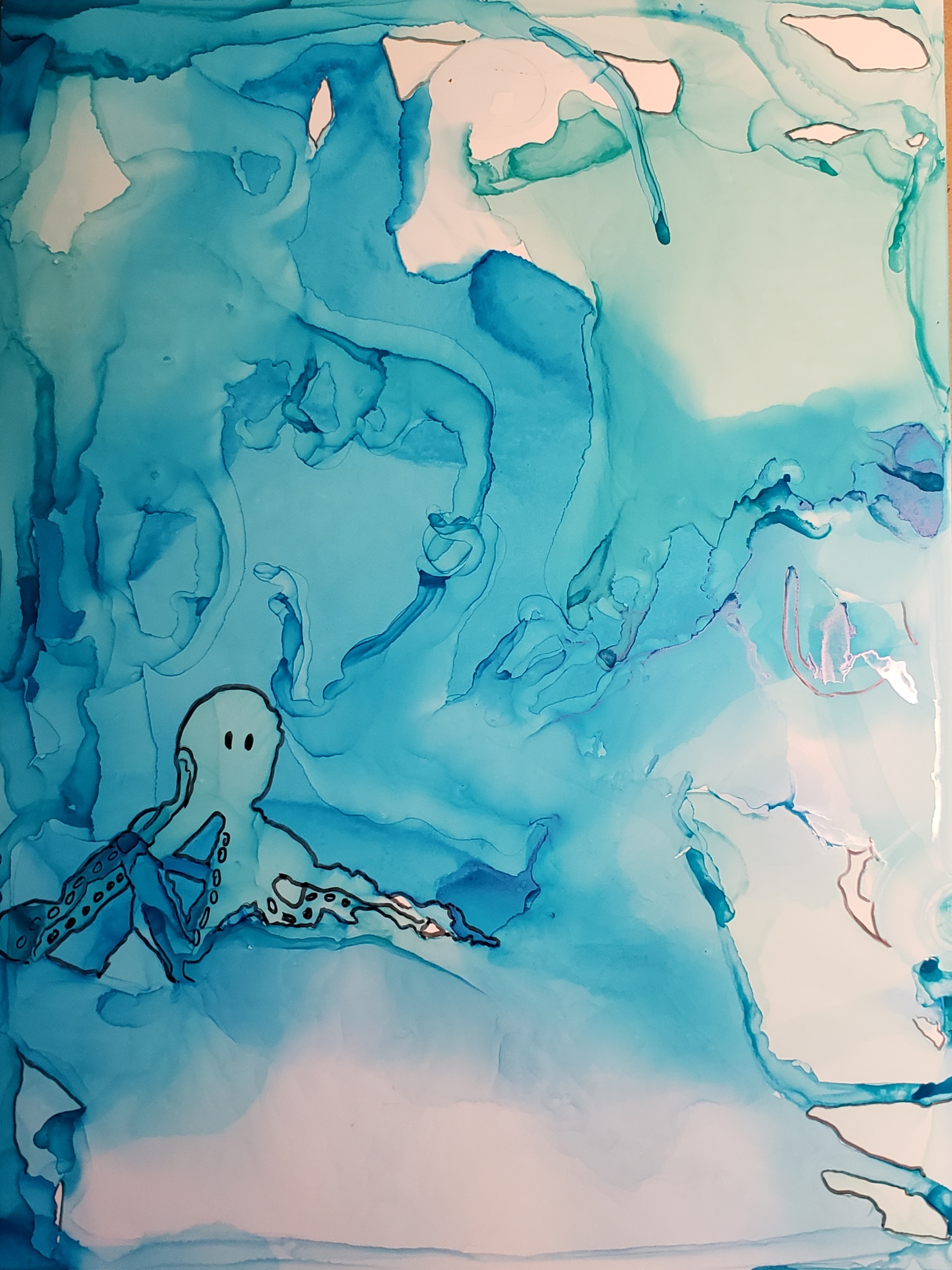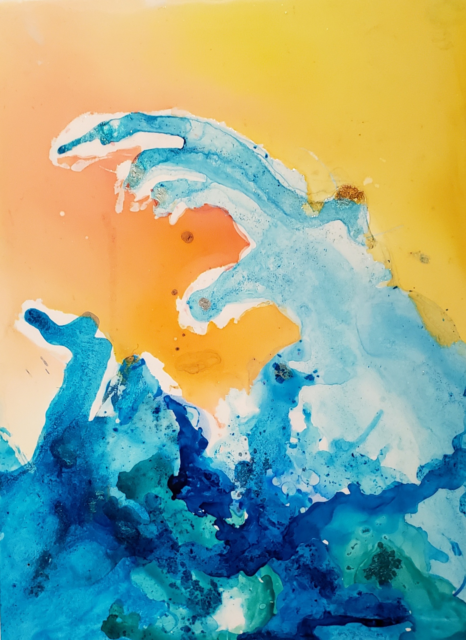 Cammo plane Ink on polypropylene Alcohol ink can be used as a fluid painting technique. The ink I bought came in small dropper-style bottles. This highly pigmented ink splashes and stains easily, so grab a pair of gloves for the sake of staying clean. Amongst the various inks in the set I bought, some are transparent and some are opaque. I saved the opaque choices for some of the resin projects – quick note – it doesn’t blend as much as it “drops” because it’s a heavier substance. Back to the ink on paper, it’s not really just “paper”, as the heading may suggest. Polypropylene is a synthetic, thin, flexible non-porous and non-absorbant plastic. It has a kodak paper feel to it. Since it doesn’t absorb, you can keep adding layers to it.
