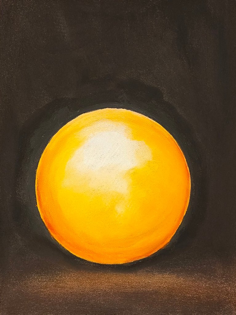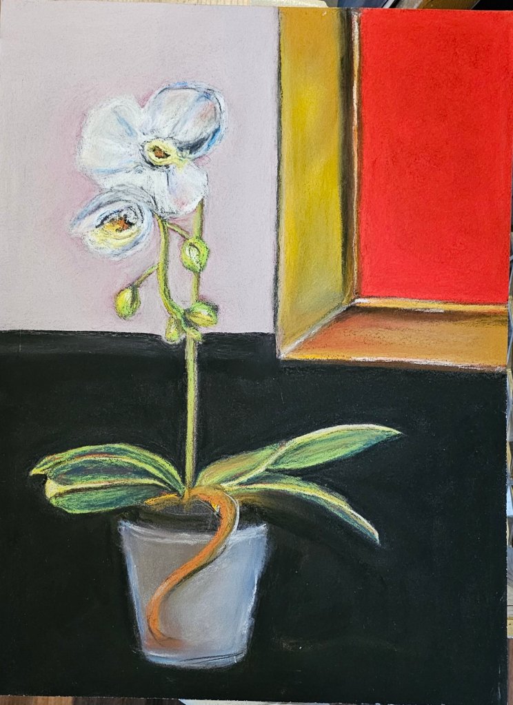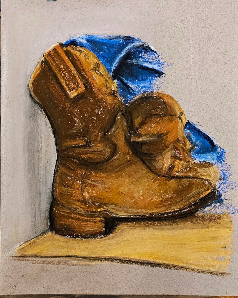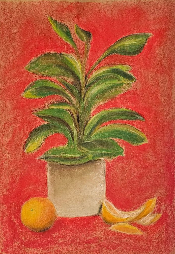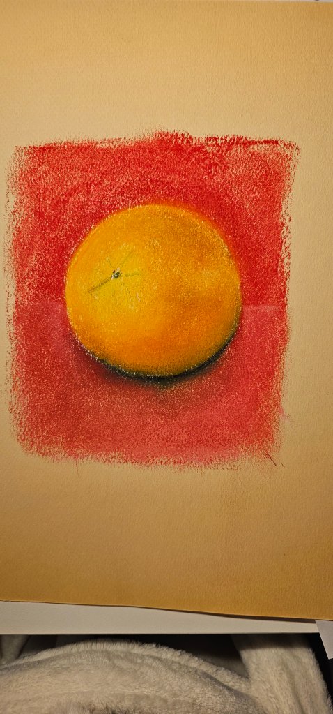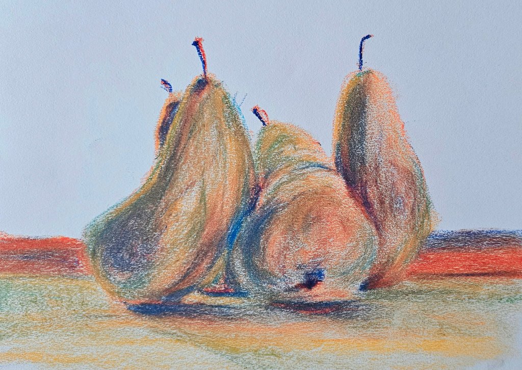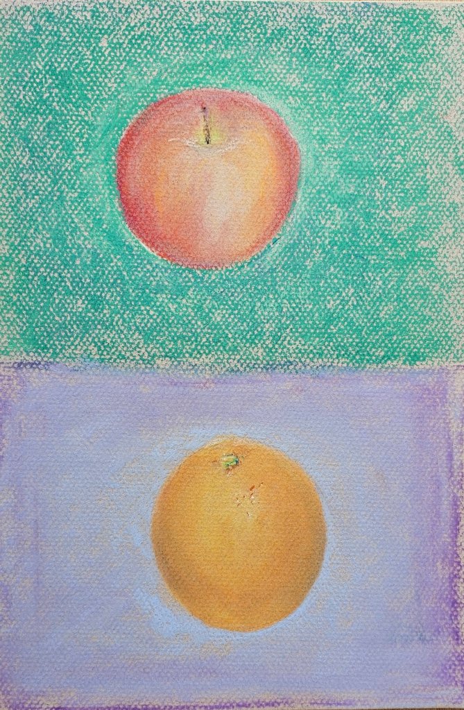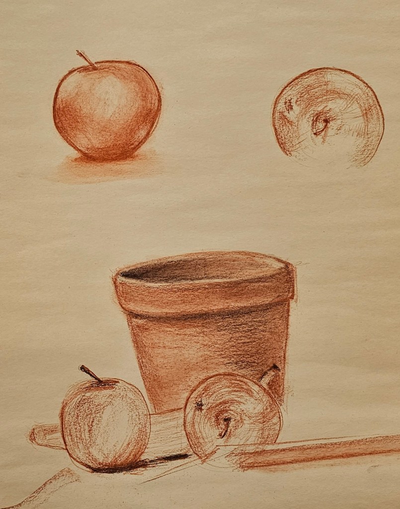 My still life with the terra cotta pot and fruit was an exercise in temperature and texture—the porous feel of the pot versus the smoother skin of the apples. Sanguine handled both with grace.