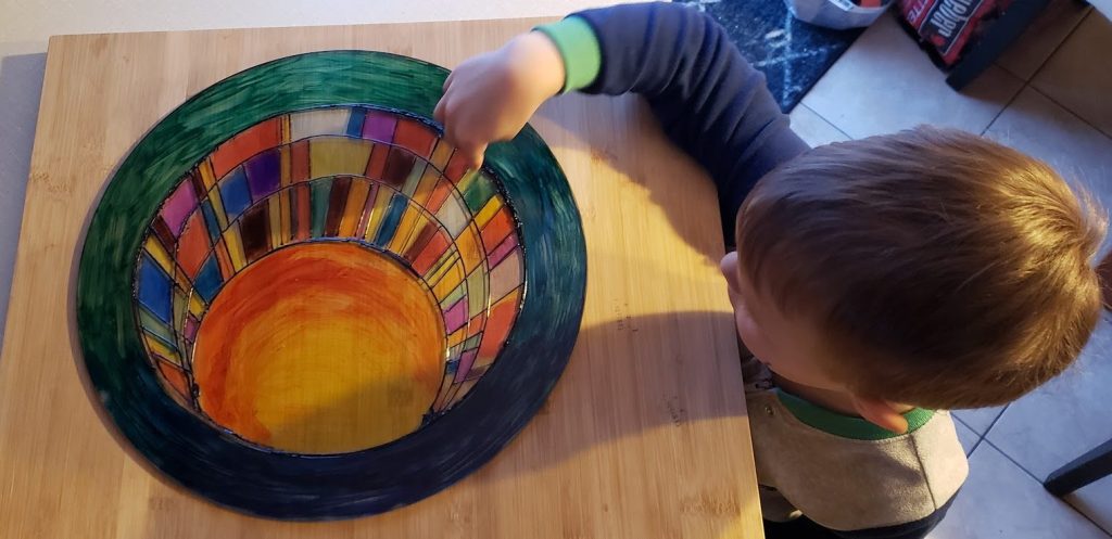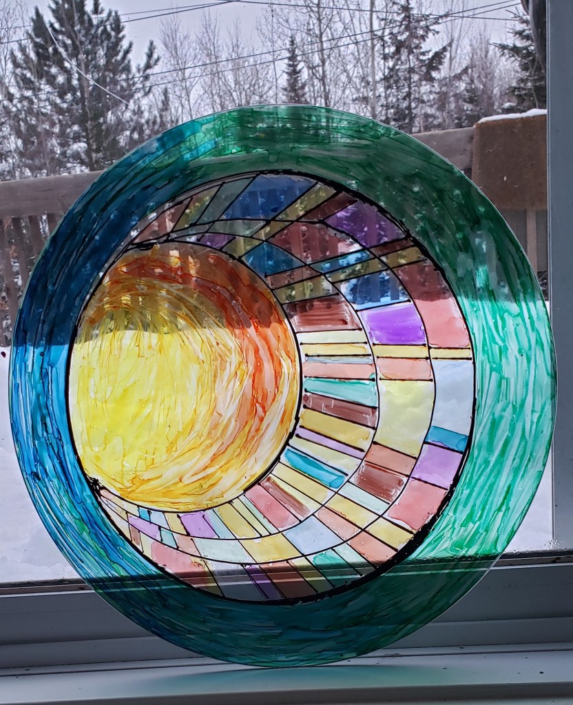 Alcohol Ink and cure on glass Did you know alcohol ink markers can be applied to other surfaces than paper? This versatile medium can be used on metal, glass (see example, above), plexiglass, jewelry, resin, fabric, added to clay, and many more contexts. Side note on the stained glass effect, if I were to do it again, I’ll just draw straight on a home window. If you want to remove what you’ve done, just scrub it with rubbing alcohol. I bought a small tube of black “cure” from the art store, it’s the raised black borders that really give it a more authentic look and feel. If you use cure, you’d be best to apply it first.