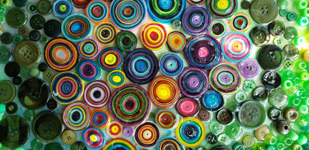 Paper quills and buttons sealed in epoxy.
