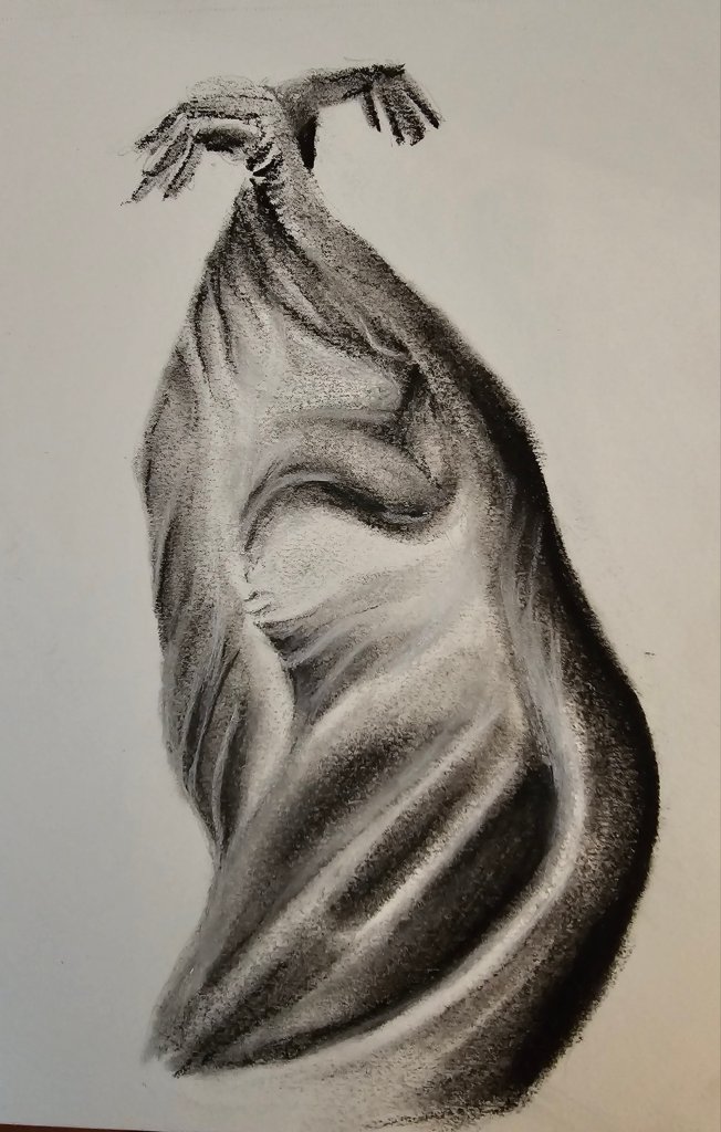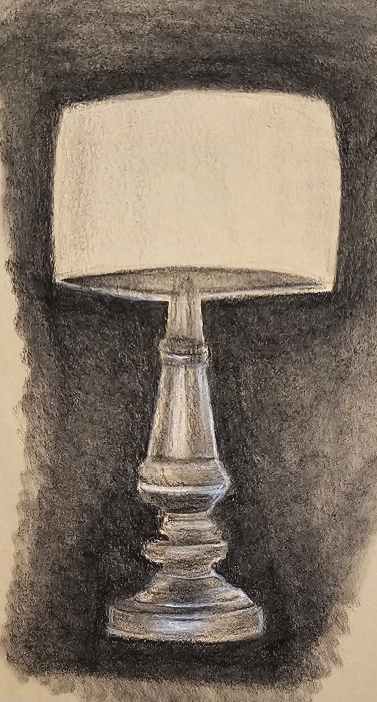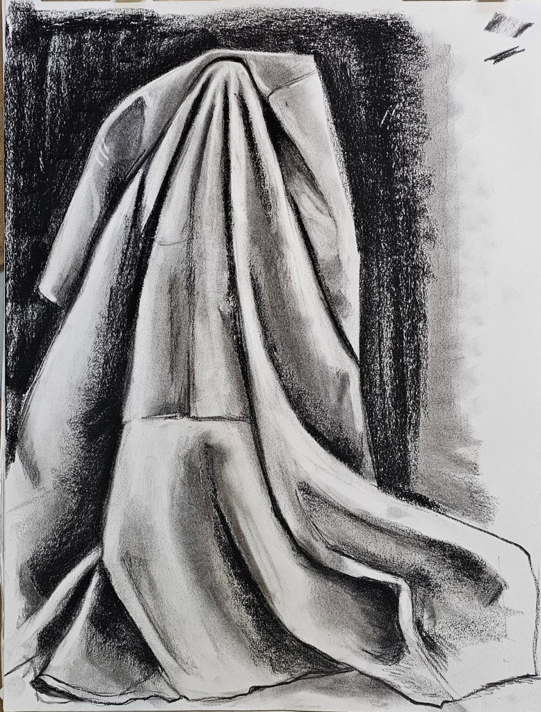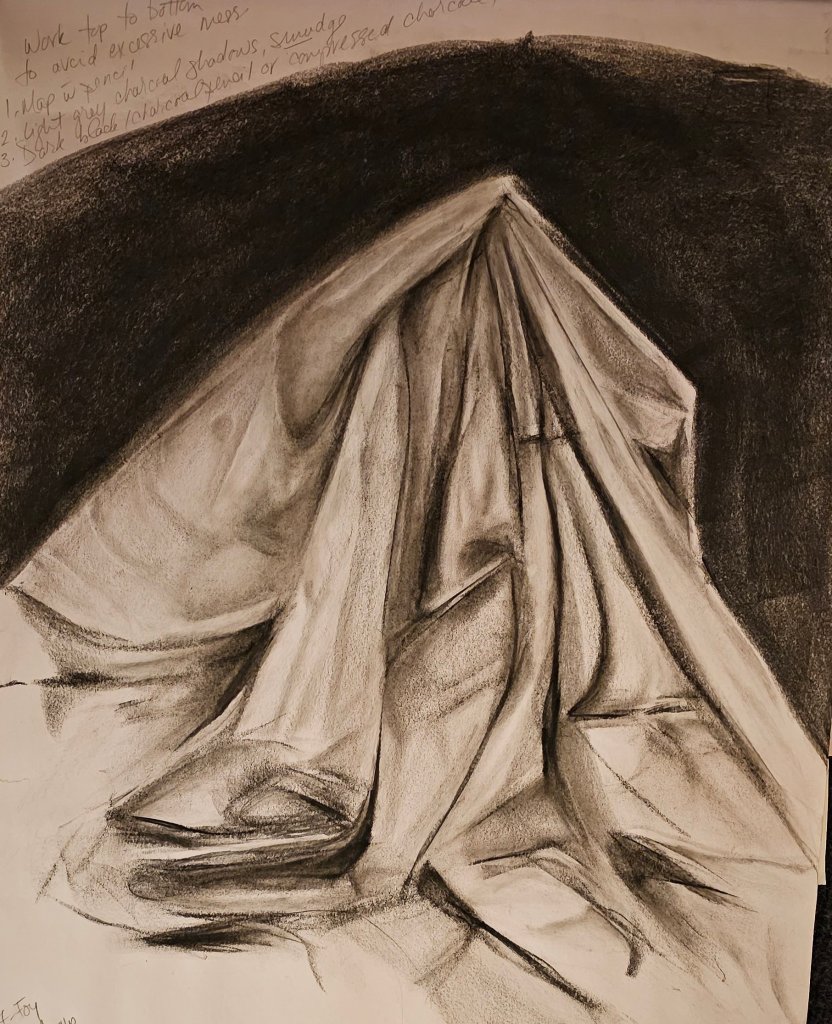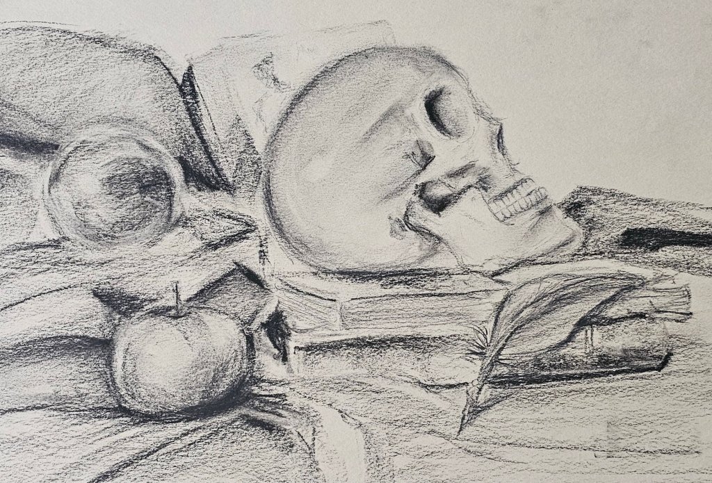 I often begin with a light contour sketch, keeping pressure minimal. I map out shadows first—especially in rounded forms like apples or violin bodies—and slowly layer in midtones and highlights. The violin on draped cloth was a full composition that required patience, especially in building the folds and creating the illusion of depth without overwhelming the paper.