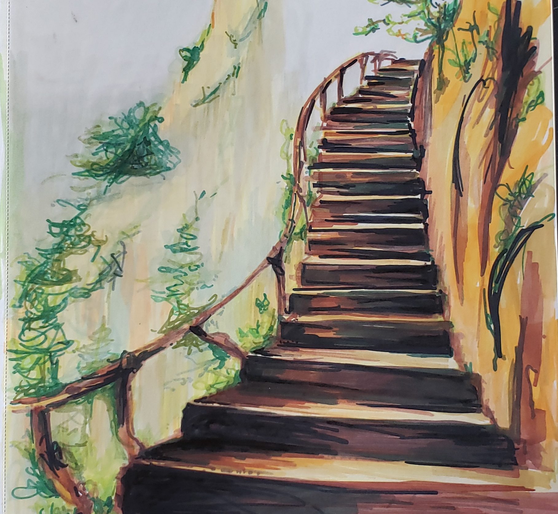 Zen Stairway The fun thing with alcohol ink markers is the variety of colours. I bought a 168 marker set for relatively cheap off Amazon. I never knew the possibility of having so many neutral and subtle shades, as well as the dozens of greys and off-whites. Wow. It’s seriously like a candy store feeling when I open the case and I’m greeted with all the colour and potential of what I could do!!
