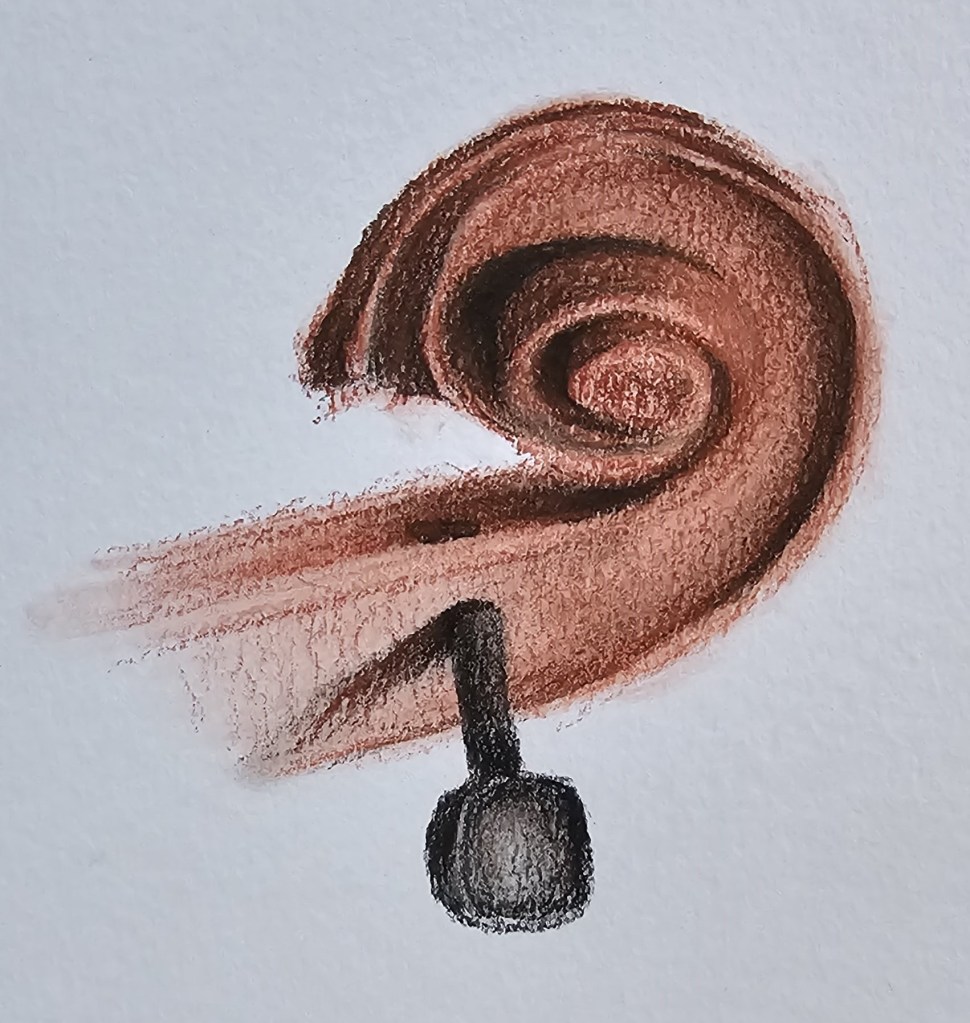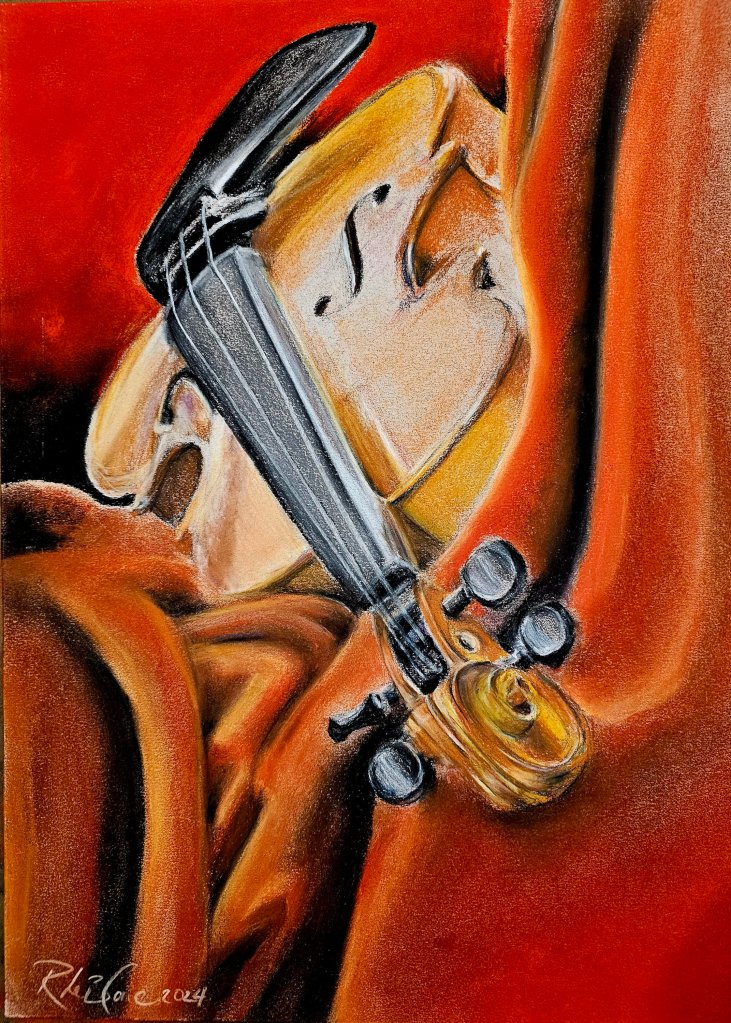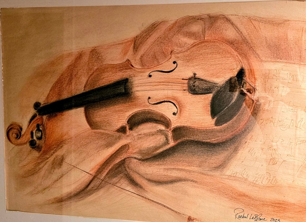One of my favorite combinations is sanguine with black charcoal pencil. That contrast allows for more dramatic shadows and detail, while still keeping the overall tone warm and cohesive. In my violin head sketch, I used the charcoal pencil to deepen the interior spiral and tuning peg, while allowing the sanguine to create form and flow along the curves.