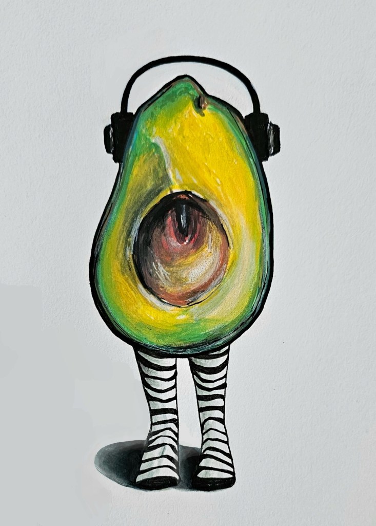 This quirky little piece was done using acrylic markers on mixed media paper, blending playful imagery with simple, bold shapes. I kept the palette vibrant, layering the acrylics slowly to build depth and contrast—especially around the pit and outer skin.
